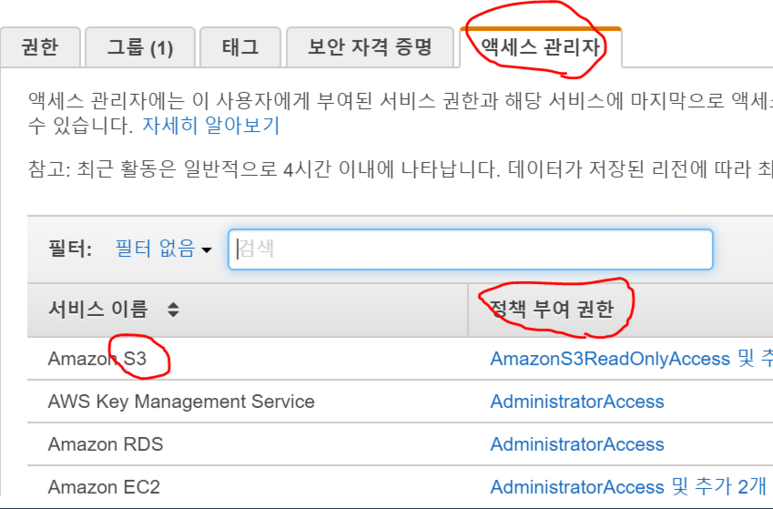 5. 액세스 관리자에 S3에 관한 권한이 있어야 한다. 정책을 추가하도록 한다.